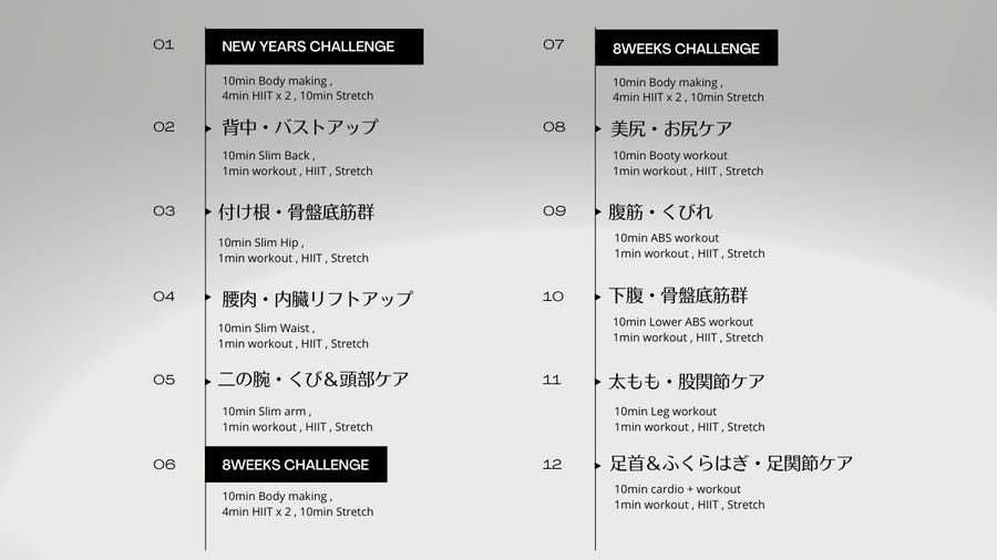 サロンでは年間を通して全身を満遍なく引き締めるプログラムを組んでいます。これは自分でエクササイズを選ぶ必要はなく、ただサロンの配信に沿って行っていれば1年後には健康的な美ボディをつくる土台が出来上がっているということです。配信は、まとめてやっても毎日やっても良いんです。ただ1年分はしっかり制覇してみる!この気合いが1年後から飛躍する素晴らしいカラダをつくります。