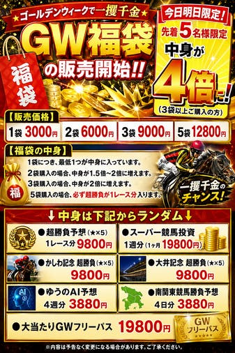 今日の予想の前にご案内です。 ┼┼┼┼┼┼┼┼┼┼┼┼┼┼┼ ★ゴールデンウィークで一攫千…