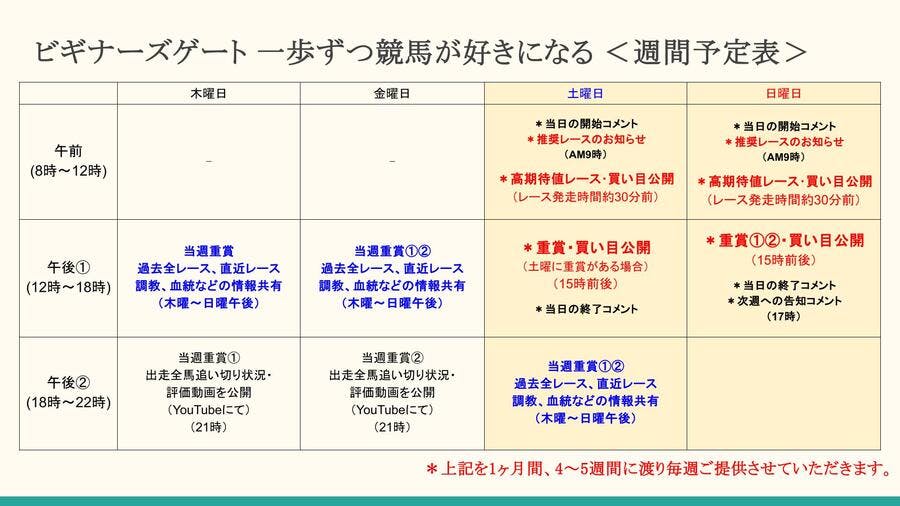 『ビギナーズゲート 〜一歩ずつ競馬が好きになる〜』は、YouTube『競馬全重賞攻略TV』と連動し、競馬を基礎から学び、一生の趣味として楽しむためのコミュニティです。当サロンでは、年間約130レースにおよぶ全ての重賞予想と、自信を持って推奨する「高期待値レース」をお届けします。 有馬記念や日本ダービー、天皇賞といったG1(24レース)をはじめ、G2(38レース)、G3(68レース)まで、JRAで開催されるメインレースをすべて予想いたします。予想にあたっては、血統・コース・当日の気配など「22の分析ポイントをすべてチェックしています。